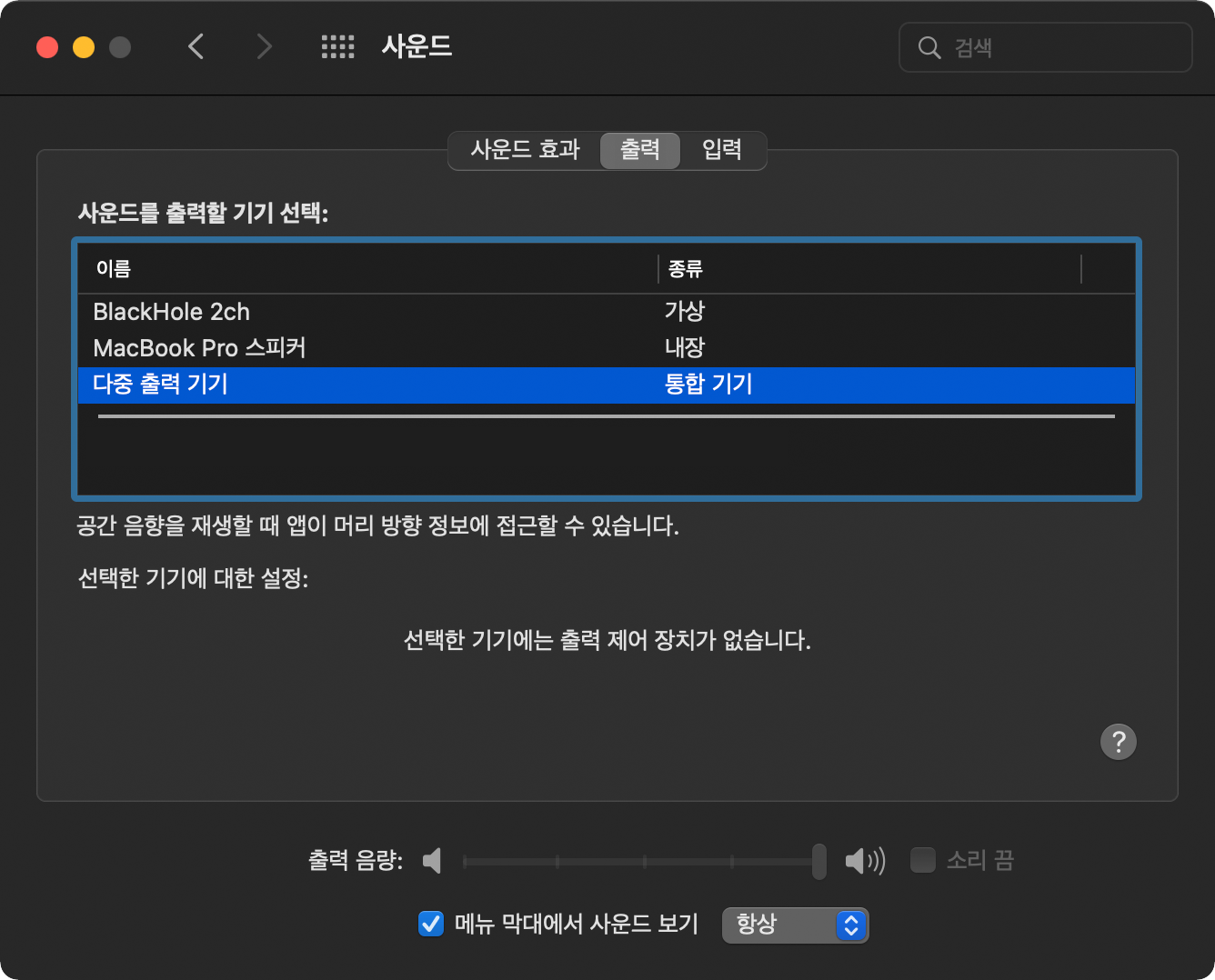 여기에 설치된 BlackHole 2ch과 MacBook Pro 스피커를 둘 다 사용으로 선택합니다.